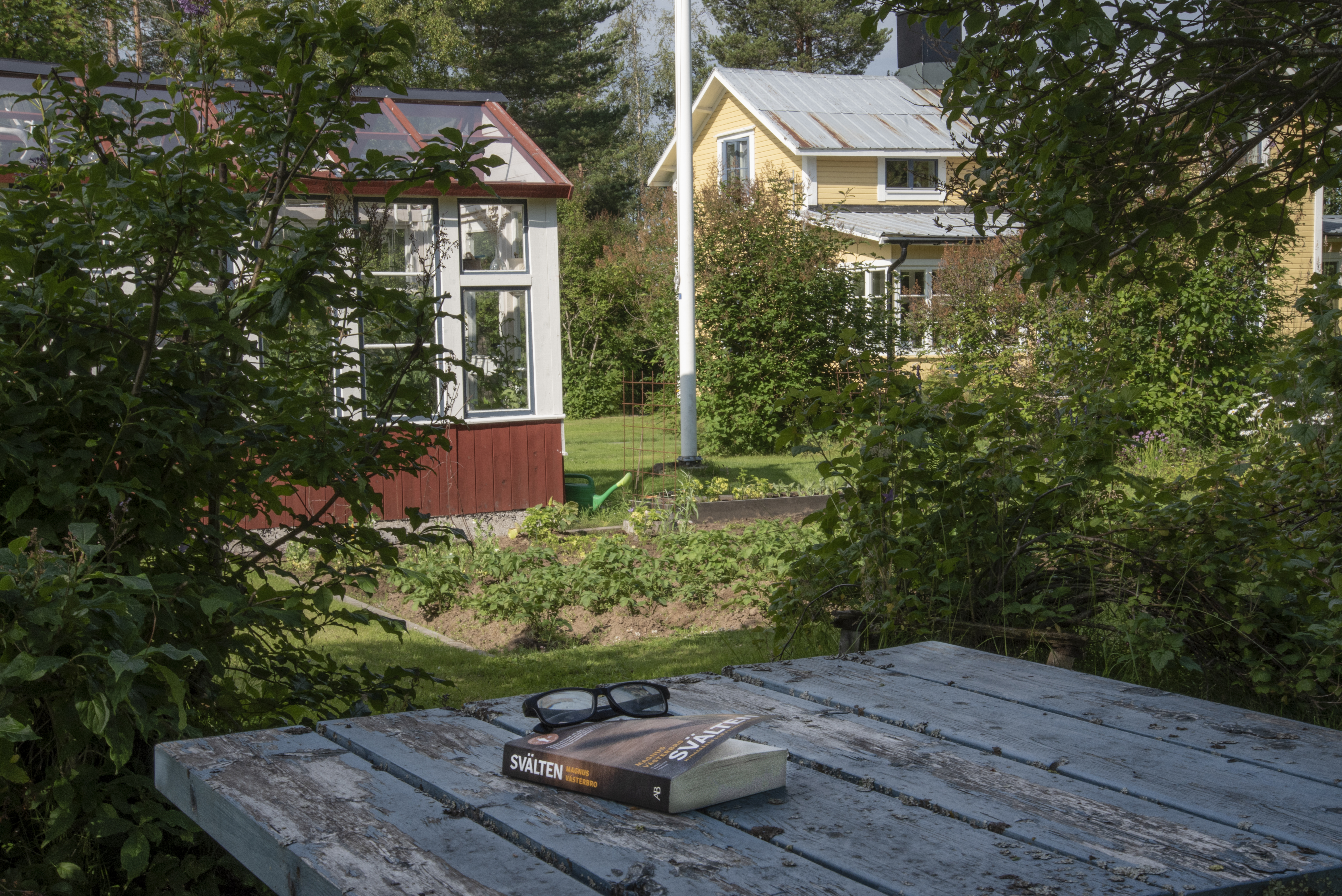 Sådana kontraster. Medan jag betraktar all spirande rikedom bland grönskan läser jag Svälten av Magnus Västerbro, som handlar om de svåra hungeråren 1867–1869. En ilning av något som liknar skam fladdrar förbi när jag läser och samtidigt betänker hur vi så ofta är missbelåtna i vårt överflöd medan våra anmödrar och anfäder kunde vara helt utan mat under veckor i den iskalla vintern.